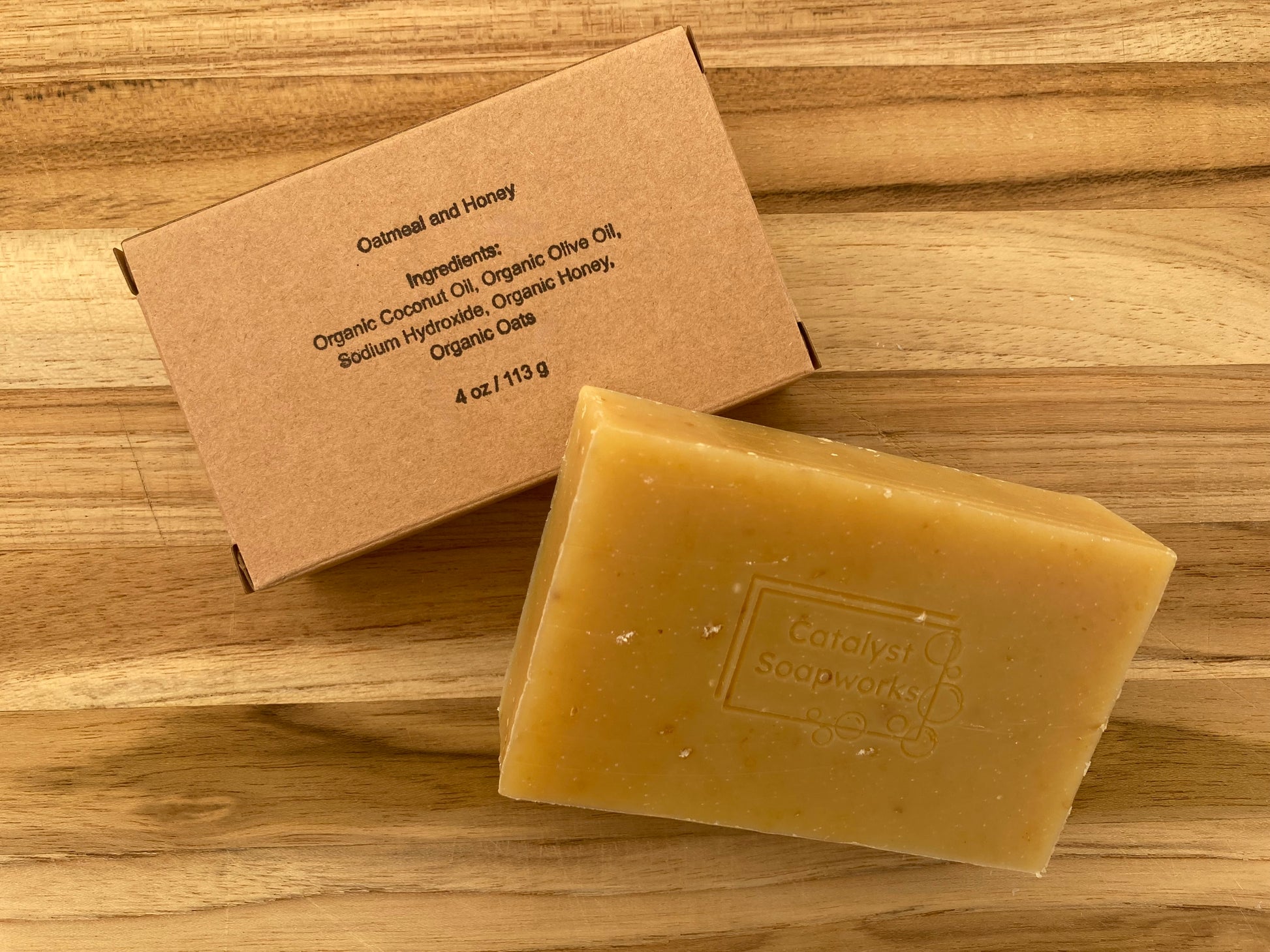 Organic olive oil, organic coconut oil, distilled water, sodium hydroxide* (none remains after saponification), organic oats, organic honey